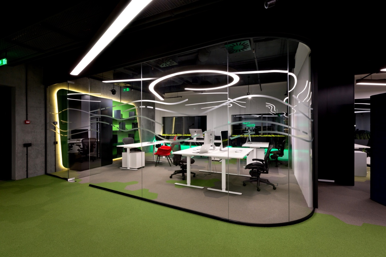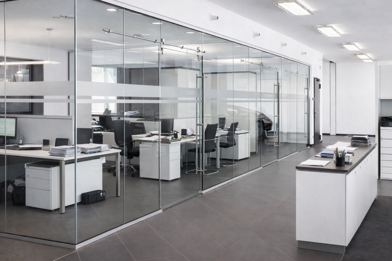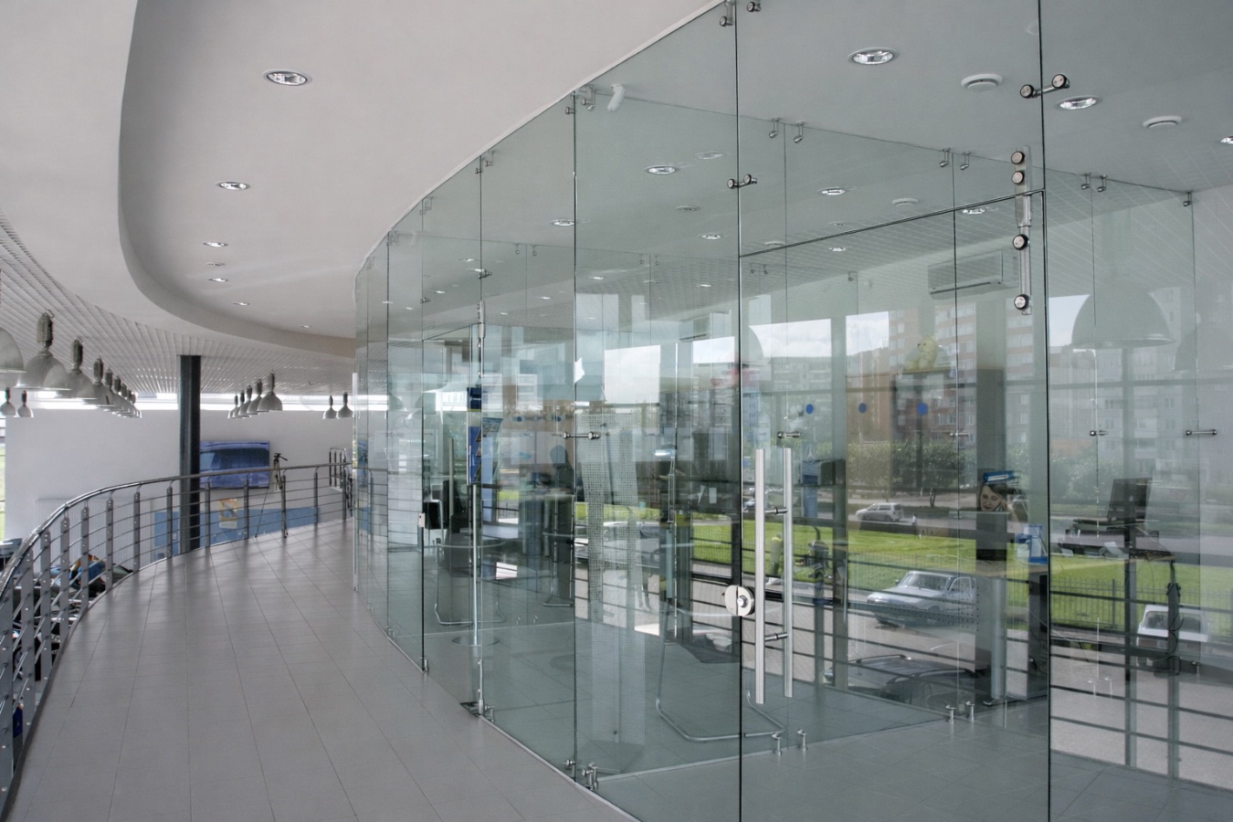 суцільнометалеві перегородки дарують можливість втілення різноманітних дизайнерських рішень. Загартоване скло може бути як матовим, так і прозорим, доповнюватись малюнками, печаткою, написами, оригінальною фурнітурою тощо.